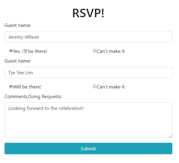 I wrote the front and back-ends for a website to allow guests who were invited to my wedding to RSVP online. The server-side code was written in Node.js, which interacts with a MySQL database to store and update invitee information. I used bootstrap to make a quick and simple interface. |
