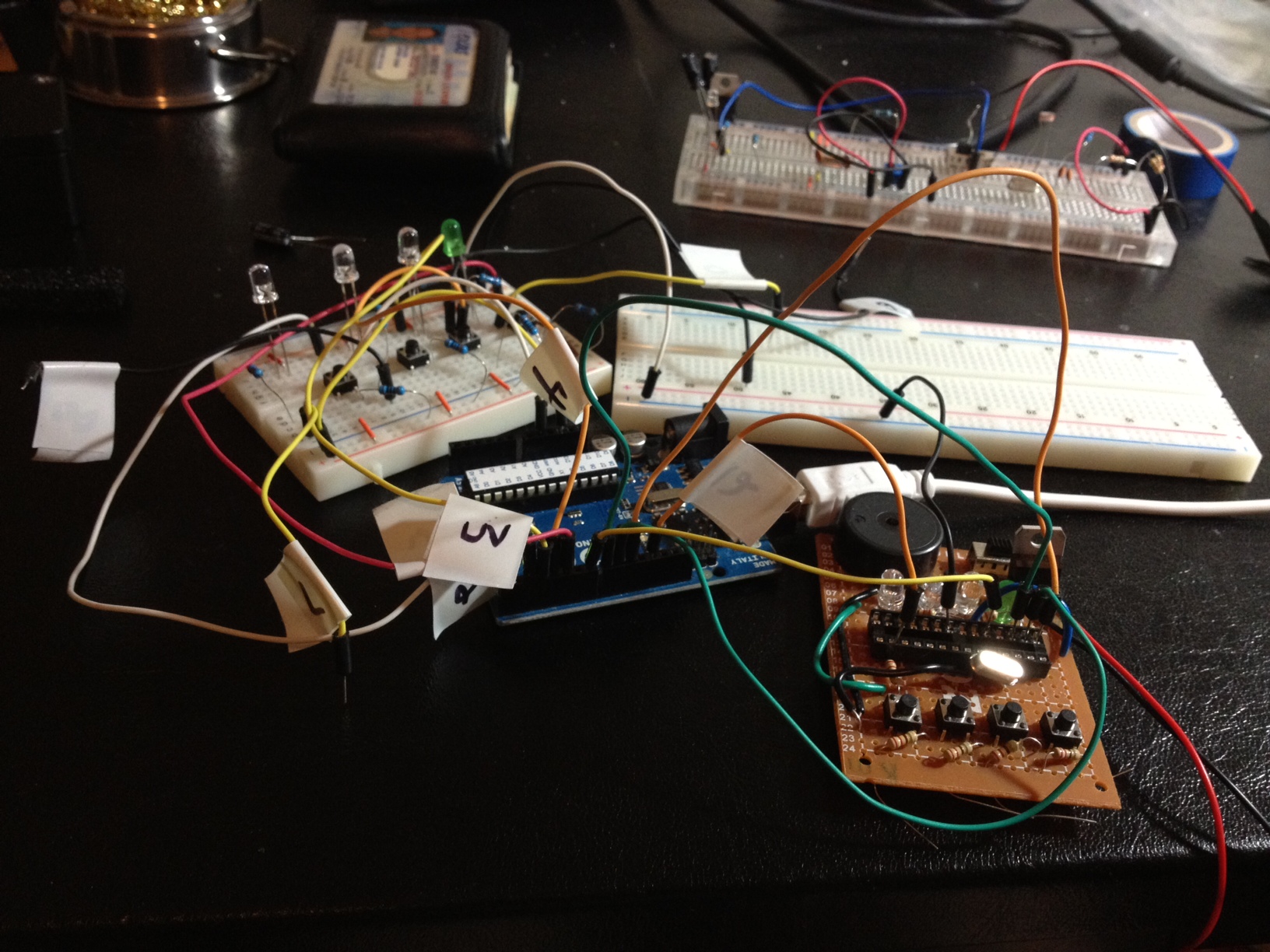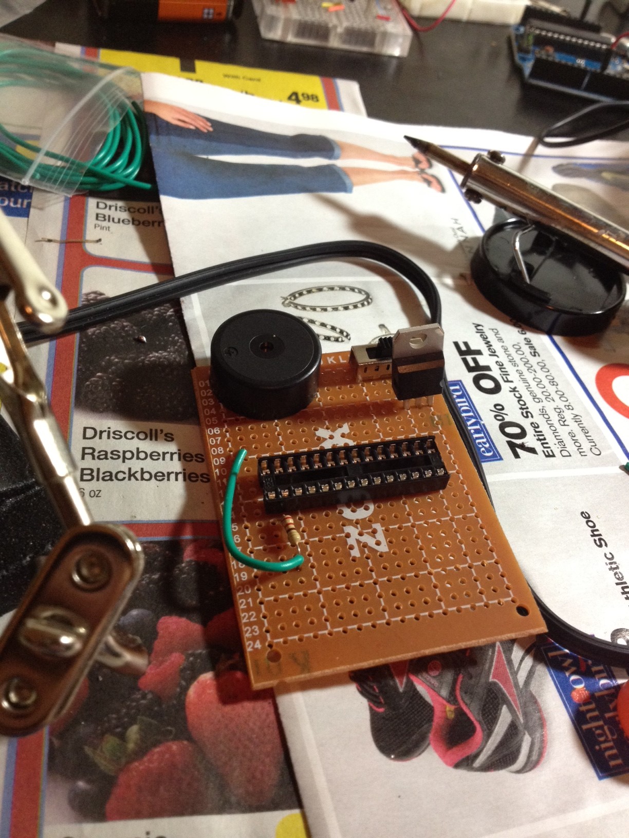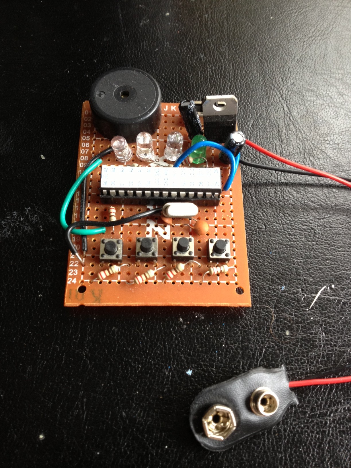 The Simon game was my first real project, and I wanted to make it a permanent portable board that I could bring around to allow people to play. I laid out the board by hand (this was before I learned how much easier it is in Fritzing) and began soldering.