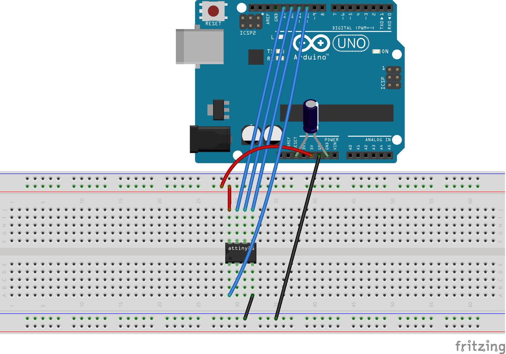 I ended up enjoying using my standalone prototype so much that I wanted to try to make more of these little guys to try on friends and family. I figured if it helped me fall asleep faster, it could help others as well. So I did some research and found out that I could program an ATtiny85 (much cheaper than the ATMega328) using Arduino, and whipped up a breadboard with all the necessary connections.