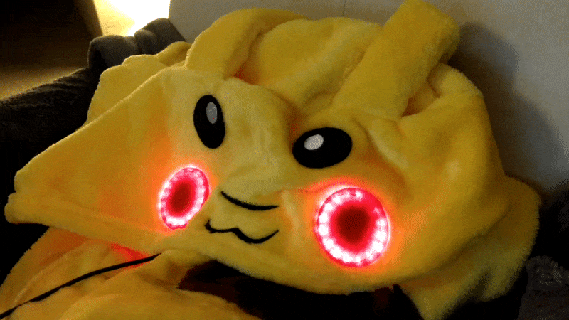 I bought a Pikachu onesie and picked up a couple of neopixel rings. I wired up the rings to an Arduino nano board and programmed a series of light patterns that the nano would loop through.