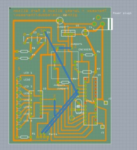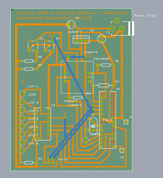 I started out by designing the PCB based on the wiring from the pre-perf PCB schematic I used to create the first Theremax. Since it is a single-sided PCB, I had to use some jumper wires to make it work.