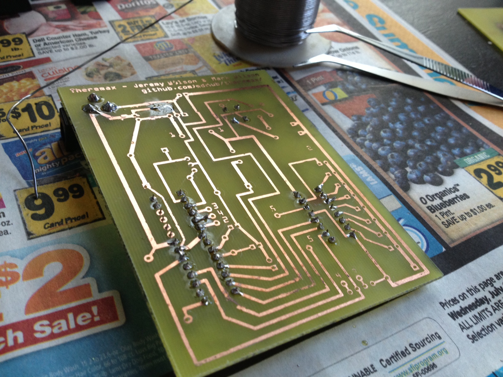 My brother and I spent a lot of time creating the Theremax, but we only produced one. We decided that I would keep the final product, and I decided that it would be a bit unfair. Thus, I decided to surprise him with his very own Theremax by trying out self-etching of my own PCB.